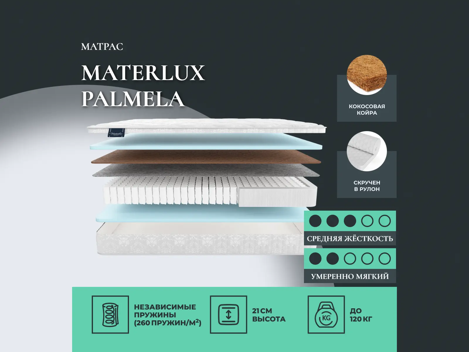 Преимущество матраса Palmela — он имеет 2 различные по жесткости стороны: средне-жесткую и средне-мягкую.