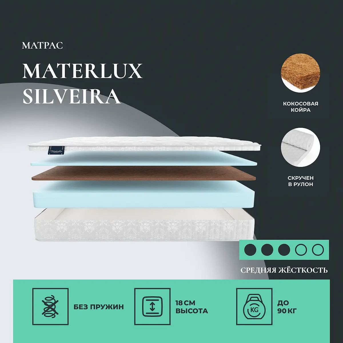 Матрас «Materlux Silveira» — средней жесткости, которая комфортна большинству людей среднего телосложения. Это — оптимальный выбор и детям, и взрослым, и пожилым людям.