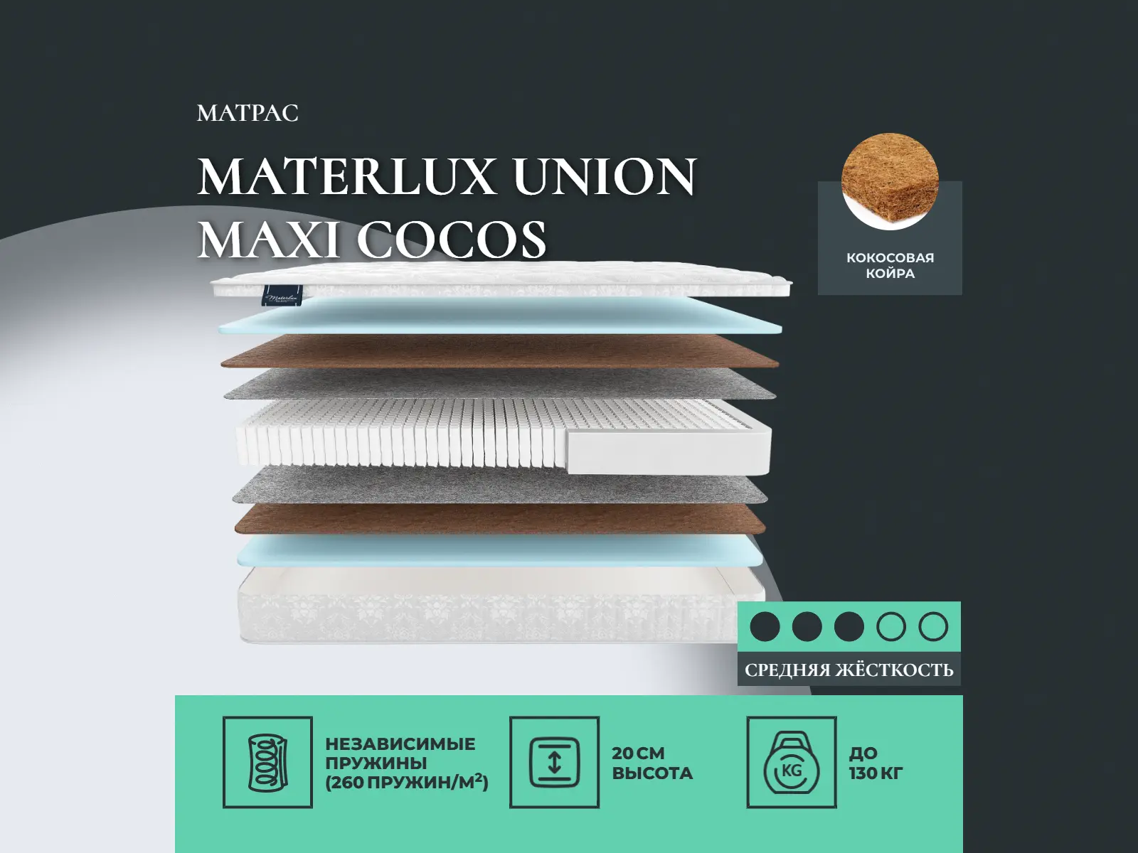 Матрас «Materlux Union Maxi Cocos» — средней жесткости, которая комфортна большинству людей среднего телосложения. Это — оптимальный выбор и детям, и взрослым, и пожилым людям.