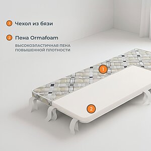Наполнение: Ormafoam высотой 6 см.Чехол: бязь с креплениями Velkro (липучки, 8 шт.). Полотно чехла стеганое. Пласти оказываются надежно скреплены с блоком Ormafoam, что предотвращает возможность смещения чехла относительно наполнителя. Максимальная нагрузка, кг: 90. Жесткость: средняя. Трансформация, градус: 180. Поставляется в вакуумной упаковке (минимальный размер - 60х160 см, максимальный размер - 180х200 см). Матрас Softy подходит для моделей диванов, кресел и кроватей-раскладушек с раскладным механизмом типа Седафлекс, Французская раскладушка. Позволяет организовать спальное место средней жесткости. Компактная упаковка и удобная ручка позволяют покупателю при покупке самостоятельно унести даже двуспальный матрас. Не рекомендуется использовать матрас, если в основании механизма дивана или кресла используются латы (ламели). Цвет и рисунок чехла может отличаться от изображенного.