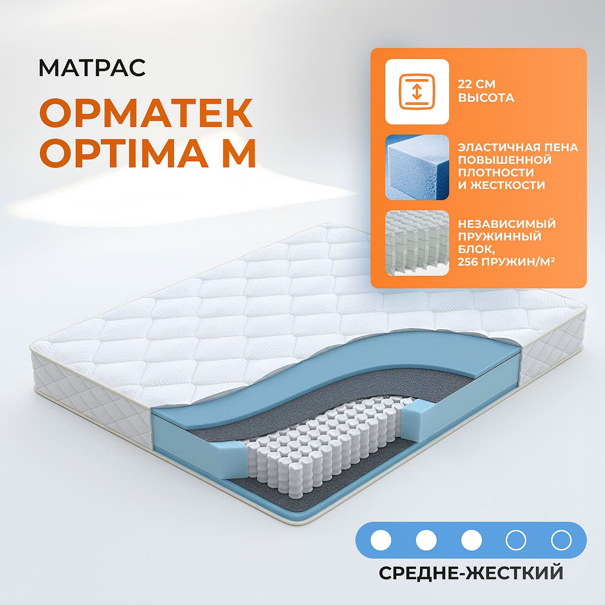 Матрас «Орматек Optima M» — средней жесткости, которая комфортна большинству людей среднего телосложения. Это — универсальный вариант и детям, и взрослым, и пожилым людям.