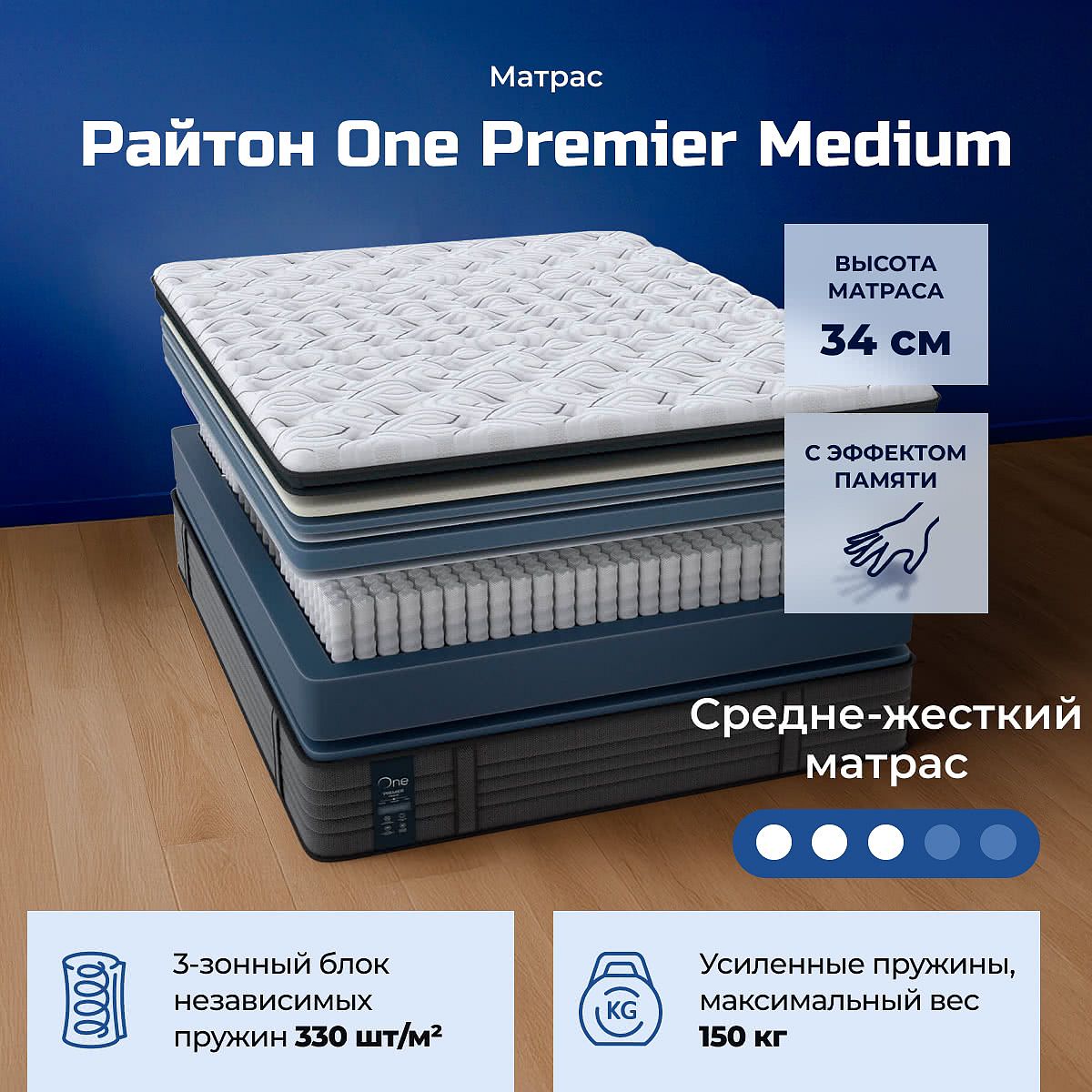 Максимальная нагрузка на спальное место, кг: 150 кг. Высота, см: 34. One Premier – самые комфортные матрасы в коллекции One. В их конструкции предусмотрен специальный PillowTop, который дарит мгновенное расслабление. При этом сохраняется высокое качество поддержки, за которую отвечает зональный блок независимых пружин в основе матраса. Матрасы Premier самые высокие среди других линеек коллекции One, их высота 34 см, поэтому они прекрасно подойдут к кроватям с высокими изголовьями.