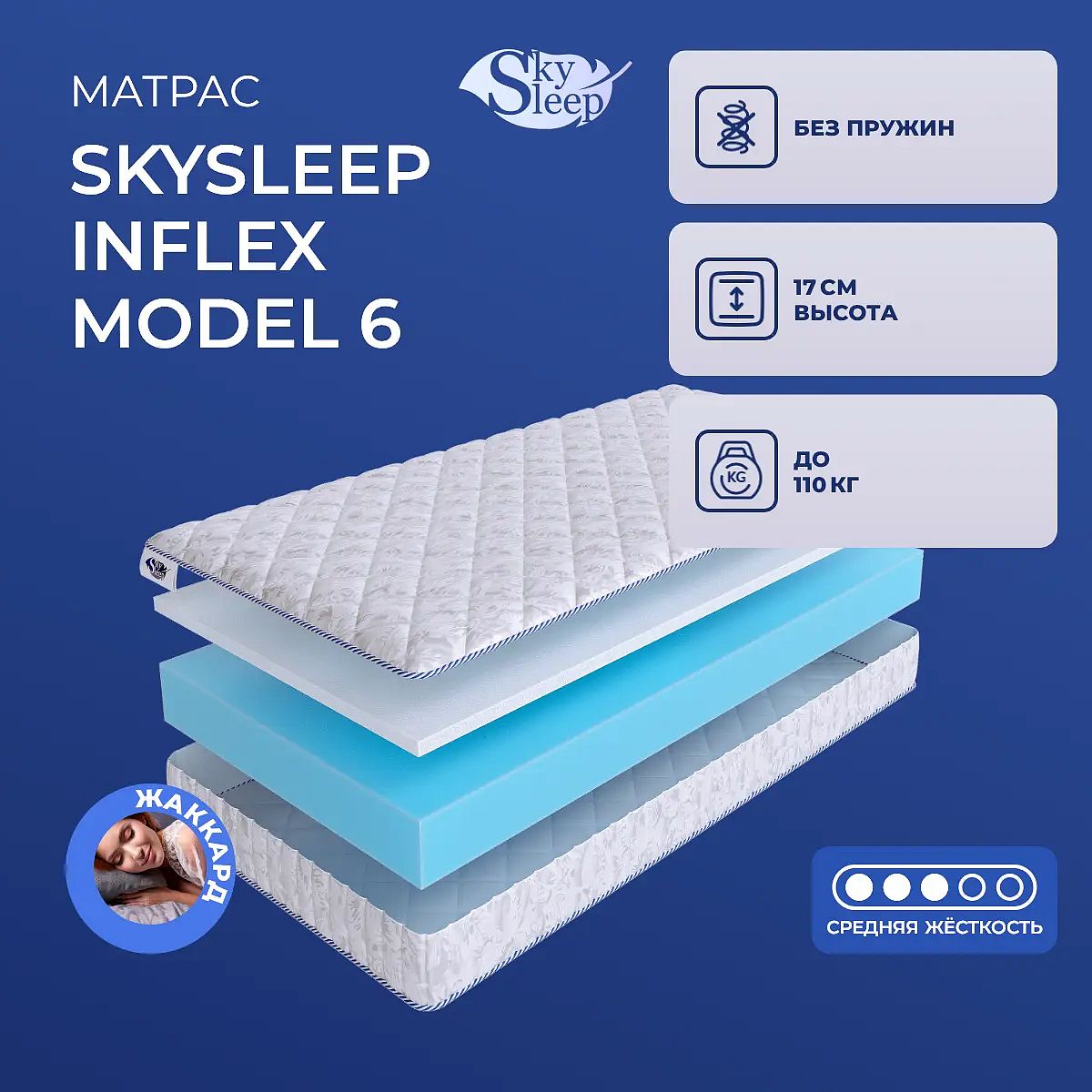 Матрас «SkySleep InFlex Model 6» — средней жесткости, которая подходит большинству людей среднего телосложения. Это — оптимальный вариант и детям, и взрослым, и пожилым людям.