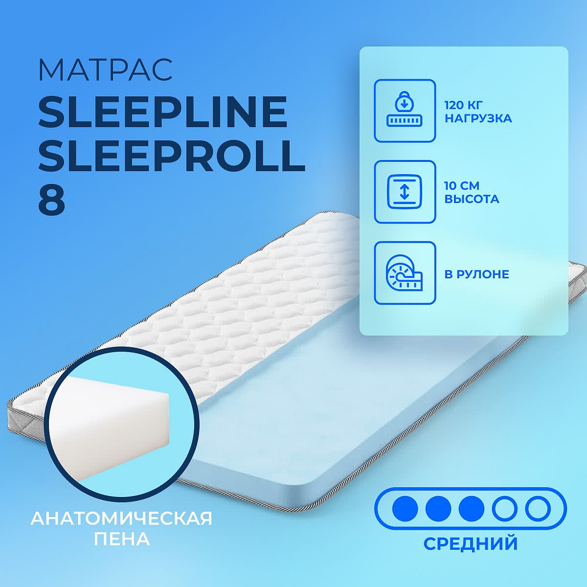 Матрас «Sleepline SleepRoll 8» — средней жесткости, которая подходит большинству людей среднего телосложения. Это — оптимальный выбор и детям, и взрослым, и пожилым людям.