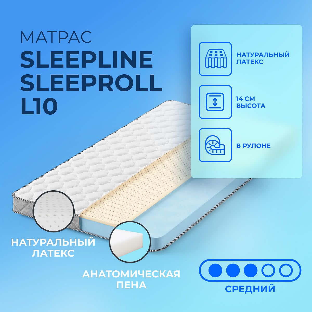 Матрас «Sleepline SleepRoll L10» — средней жесткости, которая подходит большинству людей среднего телосложения. Это — универсальный вариант и детям, и взрослым, и пожилым людям.
