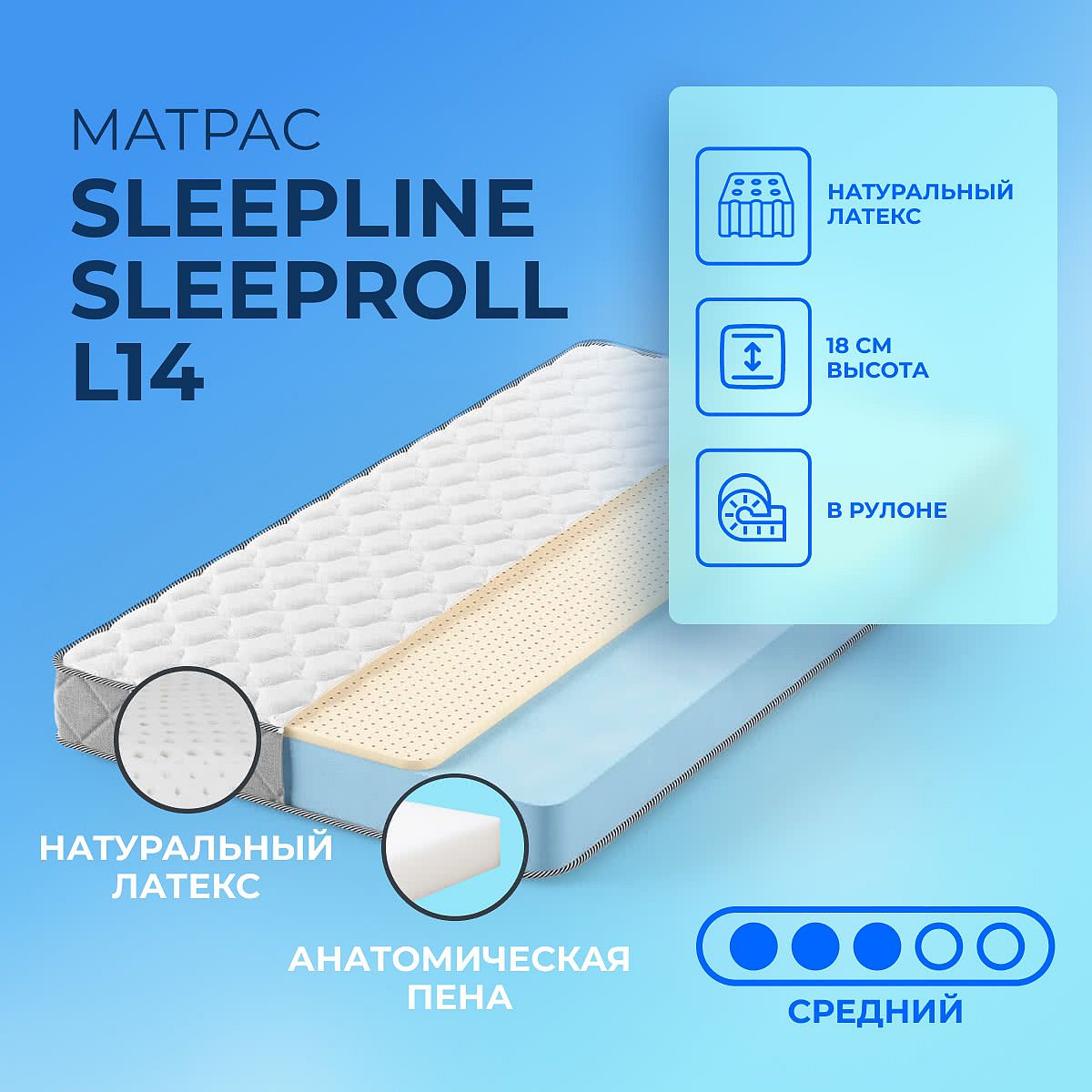 Матрас «Sleepline SleepRoll L14» — средней жесткости, которая подходит большинству людей среднего телосложения. Это — оптимальный выбор и детям, и взрослым, и пожилым людям.