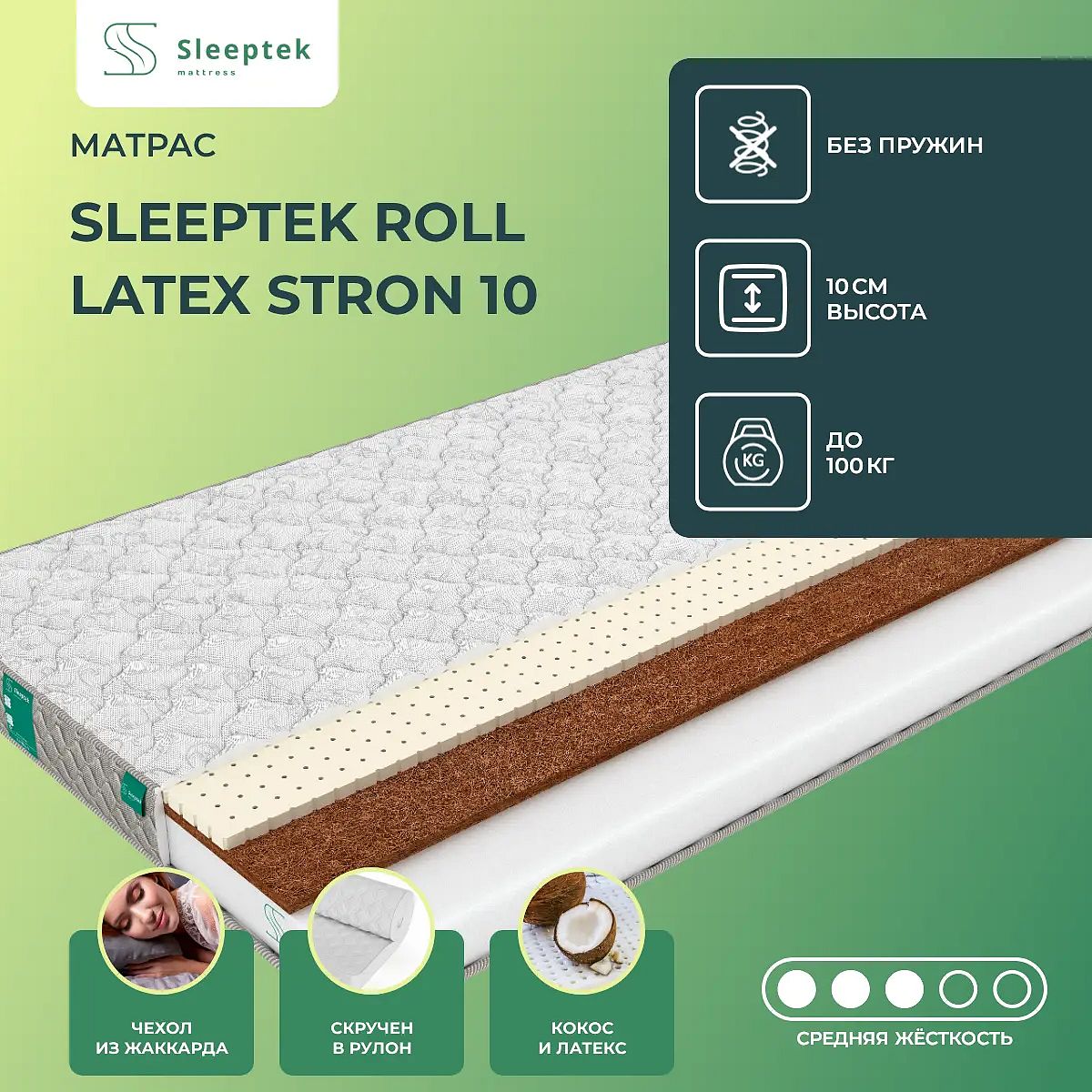 Матрас «Sleeptek Roll Latex Stron 10» — средней жесткости, которая комфортна большинству людей среднего телосложения. Это — универсальный вариант и детям, и взрослым, и пожилым людям.