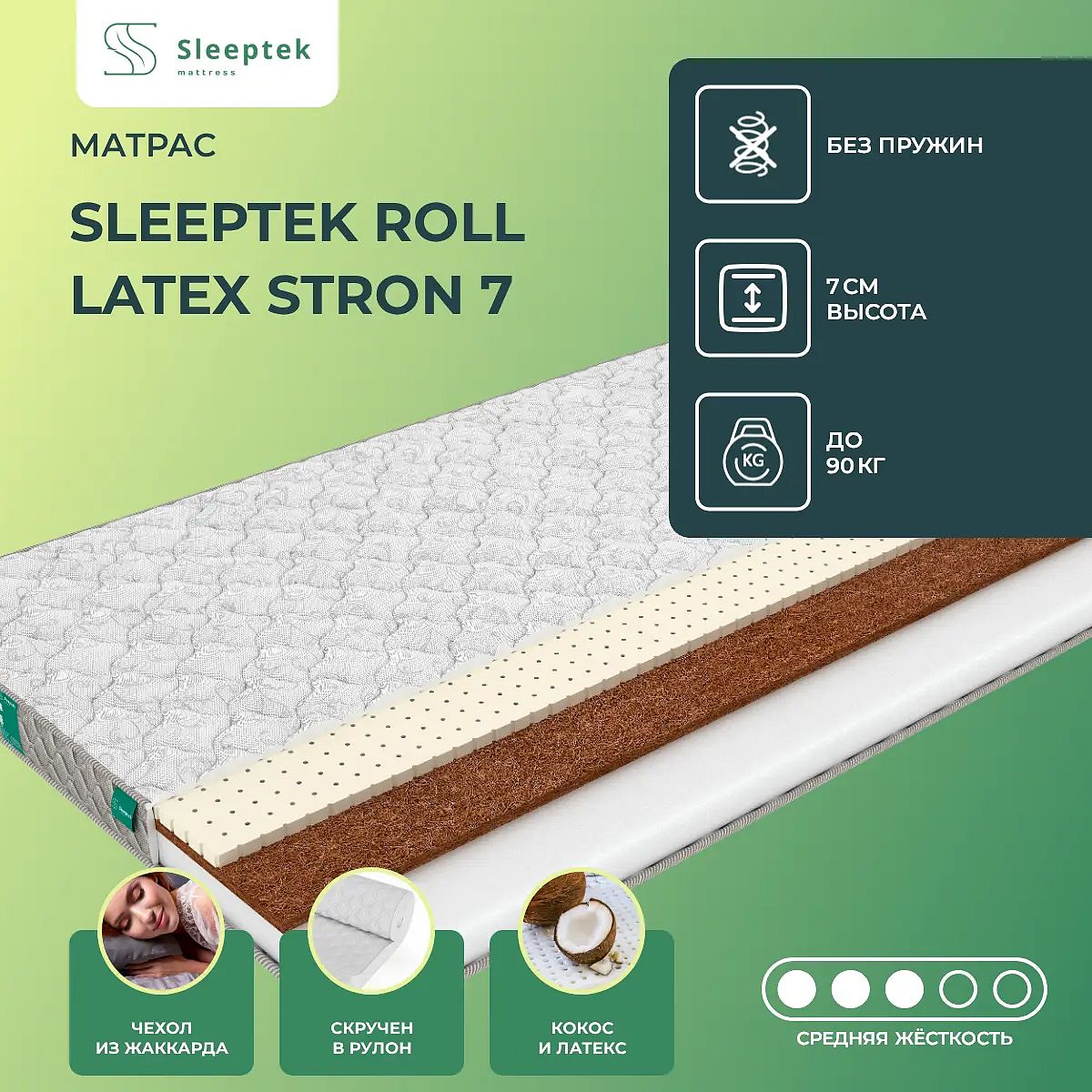 Матрас «Sleeptek Roll Latex Stron 7» — средней жесткости, которая комфортна большинству людей среднего телосложения. Это — оптимальный выбор и детям, и взрослым, и пожилым людям.