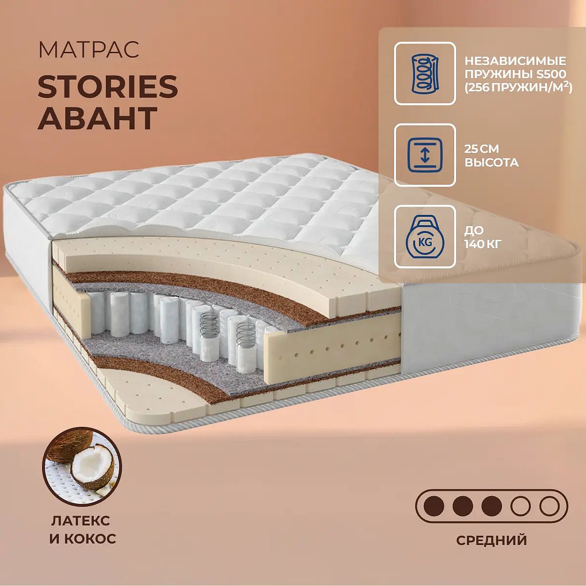 Матрас «Stories Авант» — средней жесткости, которая подходит большинству людей среднего телосложения. Это — оптимальный вариант и детям, и взрослым, и пожилым людям.