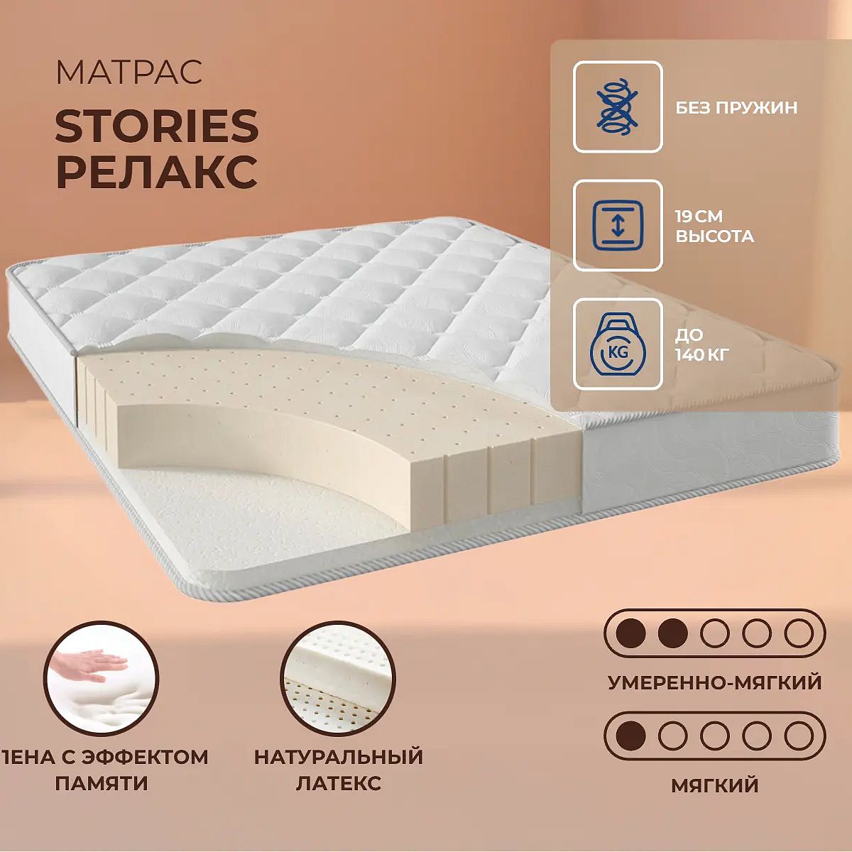 Односпальный матрас Stories Релакс 80х195 подойдет для кроватей с размерами спального места, обозначенными как 80x195 см, 800х1950 мм, 195х80 см, 1950х800 мм (ширина 80 см, длина 195 см).