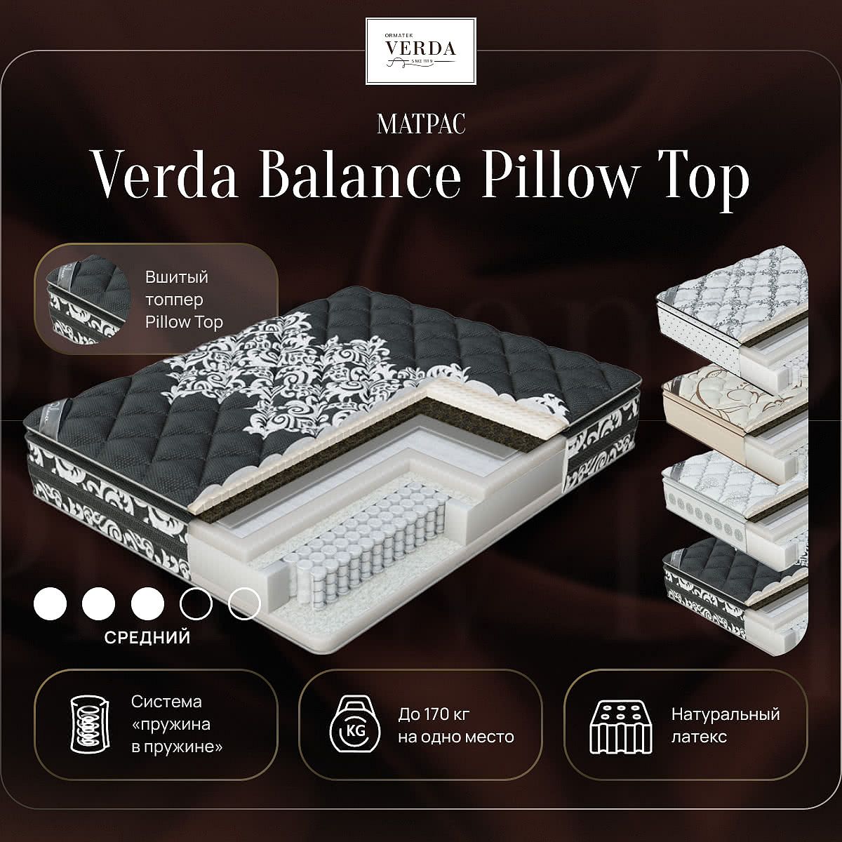 Verda Balance Pillow Top — односторонний матрас средней жесткости класса «премиум» с системой комфорта Pillow Top для наилучшей поддержки тела. Сочетанием слоев латекса, конского волоса и современных пенных материалов, имеющих разный уровень упругости и эластичности, достигаются оптимальные характеристики комфортных слоёв, и работы системы независимых пружин Double Spring. Уникальная система поддержки Double Spring «пружина в пружине» помогает позвоночнику расслабиться.Состав: