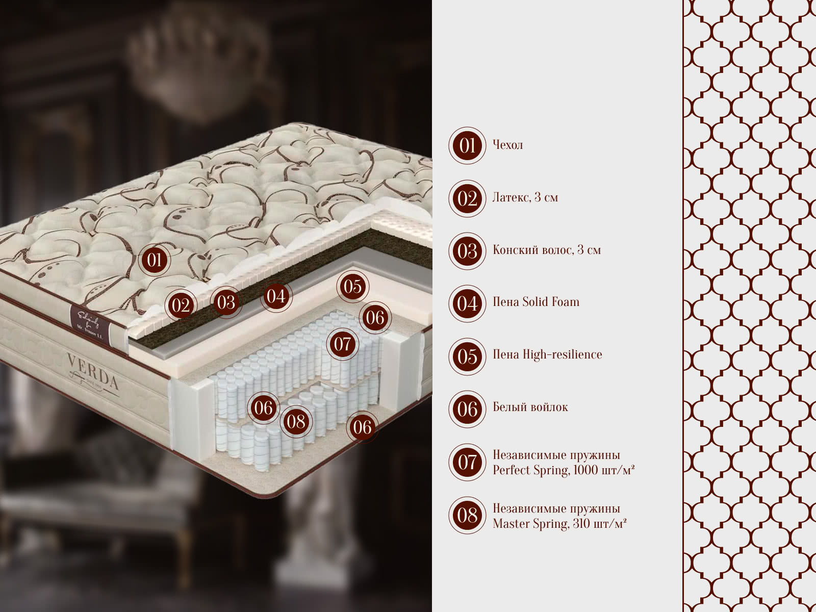 Допустимая разница в весе, кг: 80. Жесткость: средняя. Высота, см: 44. Все модели матрасов Verda доступны в 4-х цветовых вариантах чехла, каждый из которых отличается уникальным рисунком. Чехлы матрасов Verda имеют максимальное двойное наполнение гипоаллергенным материалом Micro 400, отличающимся особой стойкостью к многочисленным деформациям. Микроволокно этого наполнителя в 2 раза тоньше, чем у обычных полиэфирных наполнителей.