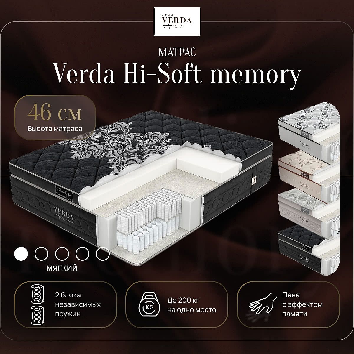 Допустимая разница в весе, кг: 80. Жесткость: низкая. Высота, см: 46. Все модели матрасов Verda доступны в 4-х цветовых вариантах чехла, каждый из которых отличается уникальным рисунком. Чехлы матрасов Verda имеют максимальное двойное наполнение гипоаллергенным материалом Micro 400, отличающимся особой стойкостью к многочисленным деформациям. Микроволокно этого наполнителя в 2 раза тоньше, чем у обычных полиэфирных наполнителей.