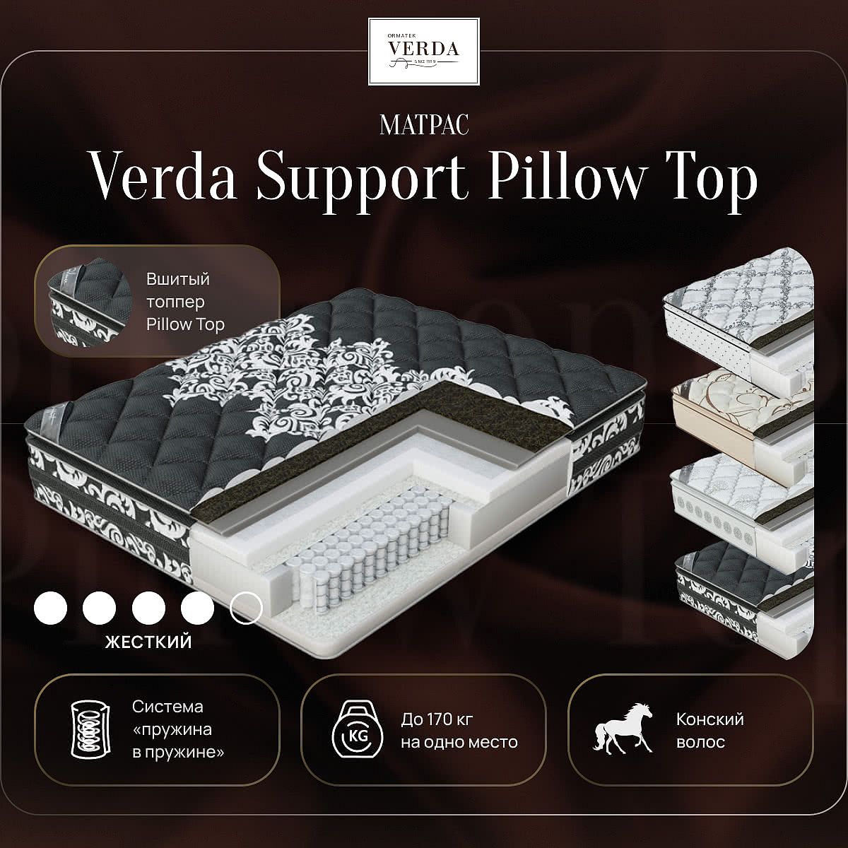 Verda Support Pillow Top — односторонний жесткий матрас класса «премиум» с системой комфорта Pillow Top. Объединяет в себе элитные материалы и передовые технологии матрасного производств. Натуральный конский волос в сочетании с высокоплотной пеной Solid foam придает поверхности комфортную жесткость и наделяет матрас превосходными анатомическими свойствами. Уникальная система поддержки Double Spring «пружина в пружине» помогает позвоночнику расслабиться. При небольших нагрузках работает внешняя пружина, а при увеличении давления на матрас – работает внутренняя пружина, тем самым обеспечивается равномерная поддержка по всей поверхности матраса, компенсируя разницу в весе партнеров. Ваш сон будет крепким и безмятежным всю ночь.Состав: