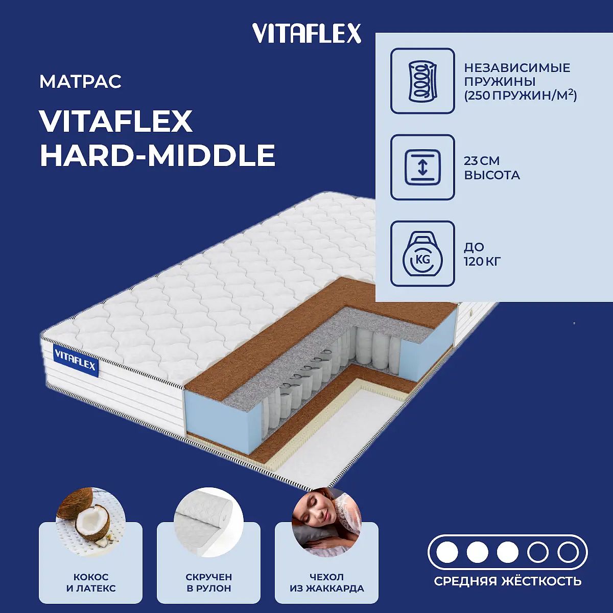 Матрас «Vitaflex Hard-Middle» — средней жесткости, которая подходит большинству людей среднего телосложения. Это — универсальный вариант и детям, и взрослым, и пожилым людям.