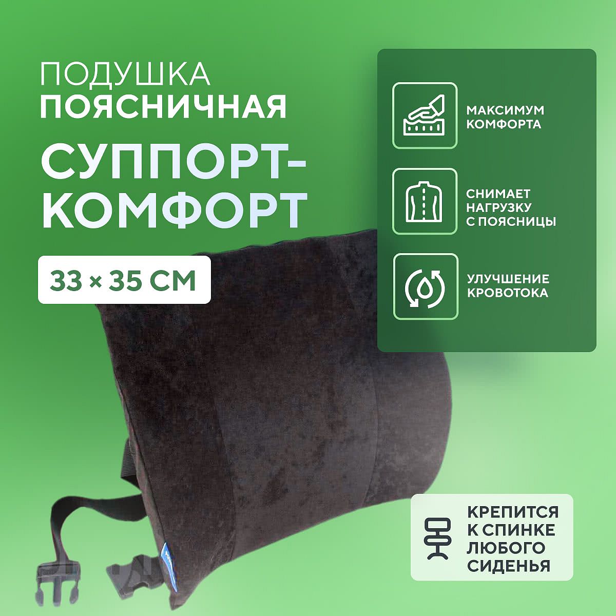 ![]() Благодаря своей анатомической форме поясничная подушка "Суппорт-комфорт" позволяет Вам сидеть выпрямившись, не сутулиться, оказывает деликатную поддержку позвоночного столба и снижает напряжение в мышцах спины и шеи, подтягивает мышцы живота, уменьшает нагрузку на передние отделы позвонков. В результате быстрее проходят боли в спине, улучшается дыхание, нормализуется состояние пищеварительного тракта и мочеполовой системы. Подушка крепится на спинку сиденья ремнем в месте поясничного изгиба позвоночника. ![]() В автомобиле![]() За рулем автомобиля очень важно принять удобное положение, чтобы спина в месте ее изгиба имела хорошую опору. Правильное положение позвоночника водителя обеспечивают специальные анатомические сиденья. Но большинство автомобилей отечественного производства (да и многие иномарки) оборудуются обычными сиденьями, после длительного сидения в которых возникает чувство усталости и даже боли в спине. Во время движения автомобиля наш позвоночник испытывает большие статические и различные вертикальные нагрузки из-за неровностей дорог, что является сильной нагрузкой на межпозвоночные диски, связочный аппарат и мышцы позвоночника. Поэтому если не предпринимать мер по защите нашего позвоночника от вредных нагрузок, то это рано или поздно может привести к развитию различных заболеваний позвоночника. Специально разработанная форма подушки Суппорт-комфорт позволяет сохранить правильную осанку в положении сидя и создает поддержку для позвоночника. Детям и подросткам![]() Каждому, у кого есть дети, хочется видеть их стройными и здоровыми. Развитие индустрии компьютерных игр, видео и телевидения приводят к еще большему снижению активности, детям приходится длительное время находиться в сидячем положении. Вспомните, что Вы делаете для того чтобы выправить осанку у своих детей, скорее всего сделаете замечание в той или иной форме: "Не горбись!", "Выпрямись!", но это не дает никаких результатов. Подложите поясничную подушку "Суппорт-комфорт" между спиной Вашего ребенка и спинкой стула за его письменным или компьютерным столом и Вам не придется волноваться, что осанка Вашего ребенка сформируется неправильно. Вы убедитесь, насколько эффективно поясничная подушка уменьшает утомляемость, повышает внимание и способность усвоения учебного материала. Вашему ребенку будет легче учиться, а поддерживать правильную осанку удобно и приятно. На работе и дома