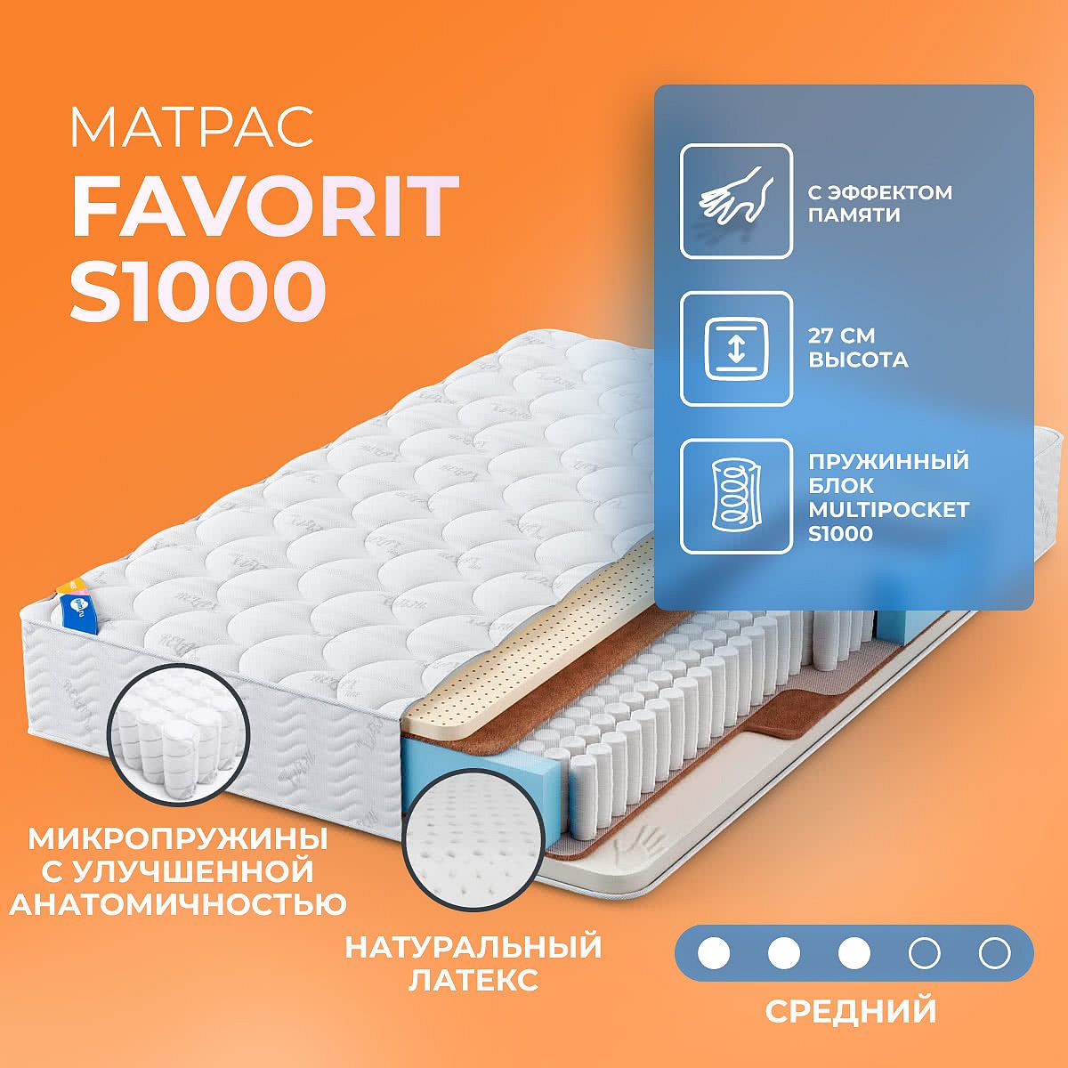 Матрас «Орматек Favorit S1000» — средней жесткости, которая подходит большинству людей среднего телосложения. Это — оптимальный вариант и детям, и взрослым, и пожилым людям.