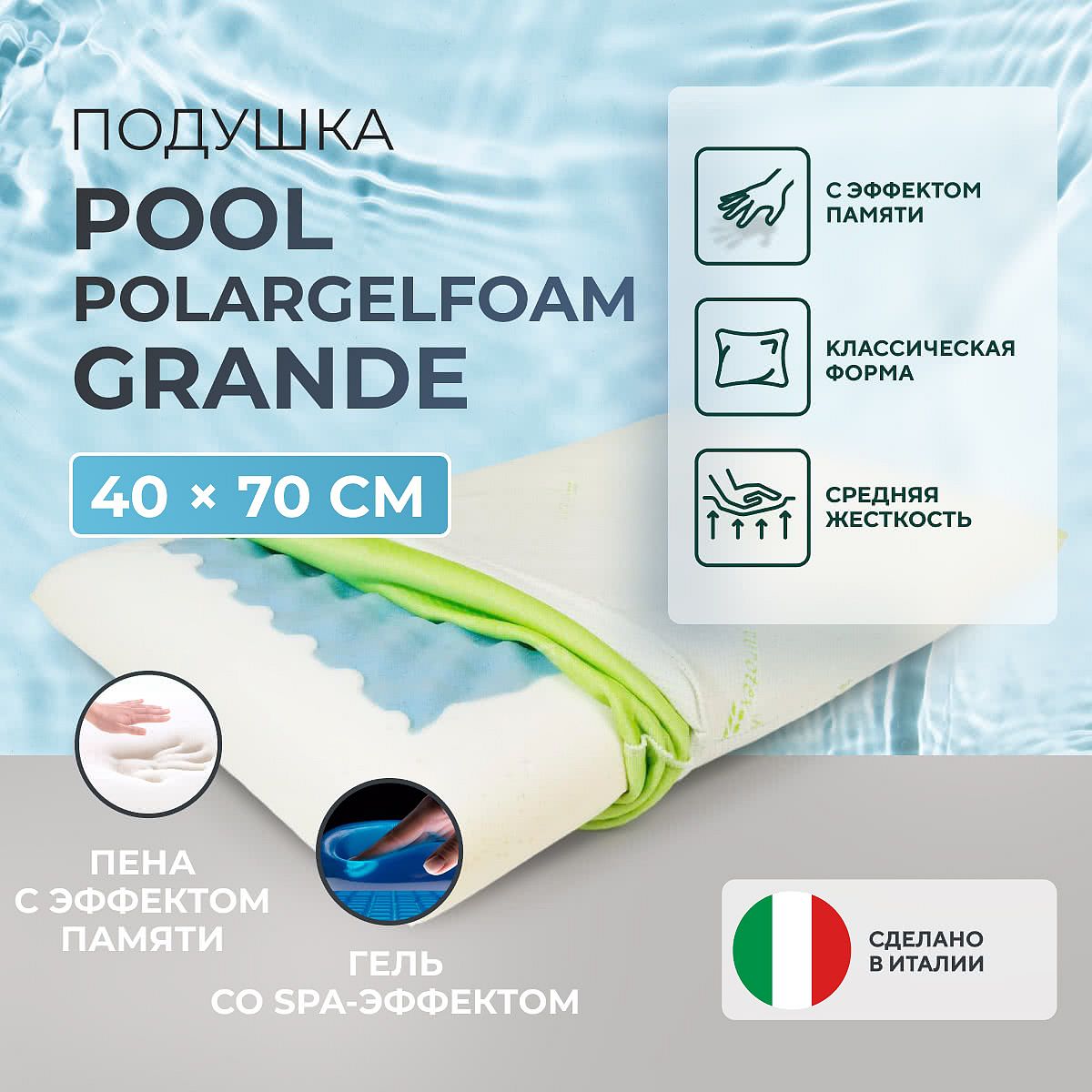 Гель или вспененный гель — новейший материал, способный снижать температуру поверхности подушки. Подушка «Pool Polargelfoam Grande» с гелем сделает отдых более комфортным и быстрей расслабит мышцы шеи во время сна.